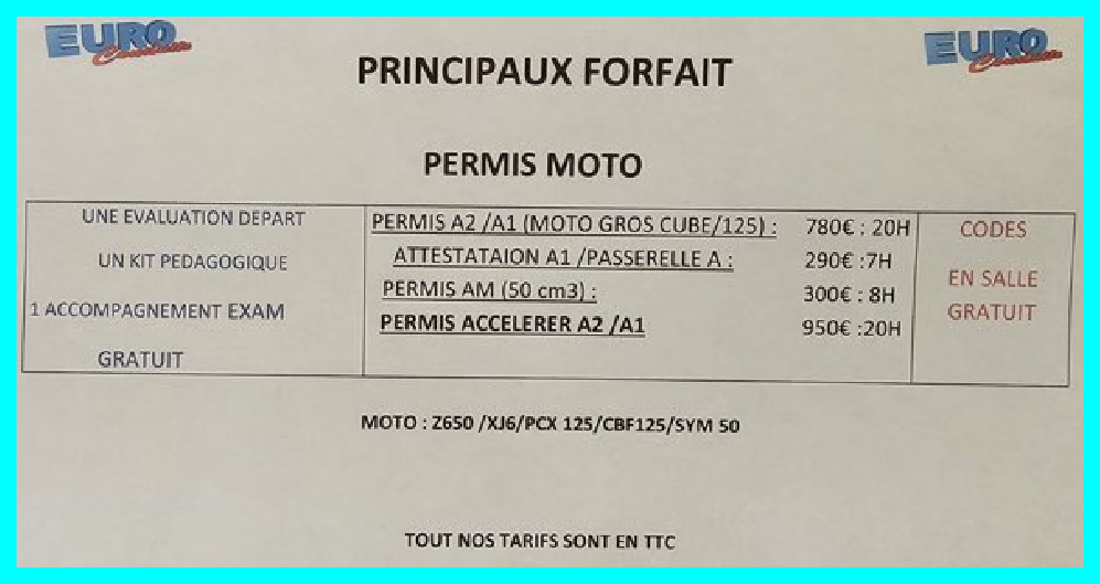 EVALUATION VOTRE FORMATION AVEC EURO CONDUITE Aix HORAIRES DES COURS RENDEZ VOUS POST ENJEUX/DEROULEMENT REGLEMENT INTERIEUR PARCOURS DE FORMATION PROGRAMME FORMATION formation préparatoire deux roues motorisés Contactez nous Tarifs hors forfait: Evaluation de départ,40,00€.  Heure de conduite, 35,00€.  Accompagnement à l’examen, 35,00€. Code en ligne, 45,00€.  Inscription à l’examen théorique, 30,00€