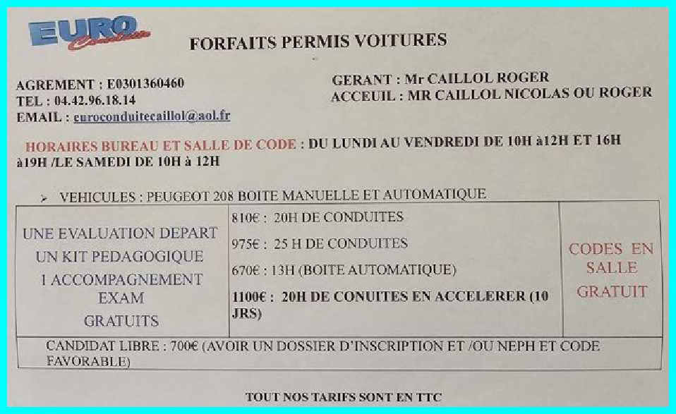 04 42 96 18 14 Accueil bureau, cours de code: Lundi au vendredi  de 10h00-12h00  & 16h00-19h00. Samedi 10h00-12h00
